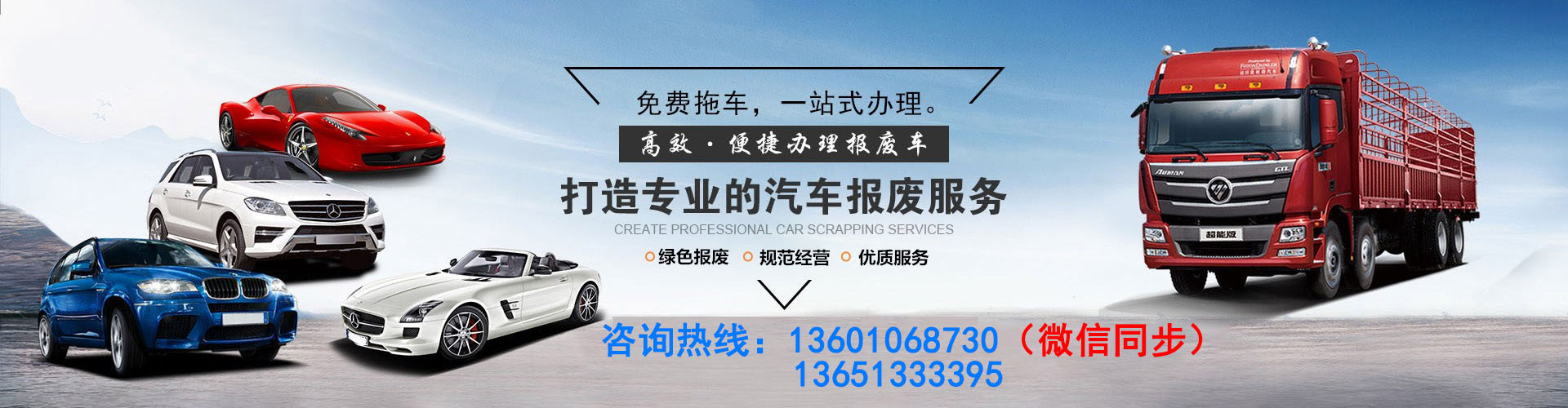 我公司在汽车报废领域有十几年的从业经验,主要面向社会车辆进行汽车报废咨询和手续一站式办理的单位,本公司主要办理:北京汽车报废、货车报废、事故车报废、特种车辆报废等,为了给广大车主提供更好的服务质量,立足于社会,我们不仅开展免费拖车服务,还为广大车主提供免费办理报废汽车手续,免费申请报废指标的服务。